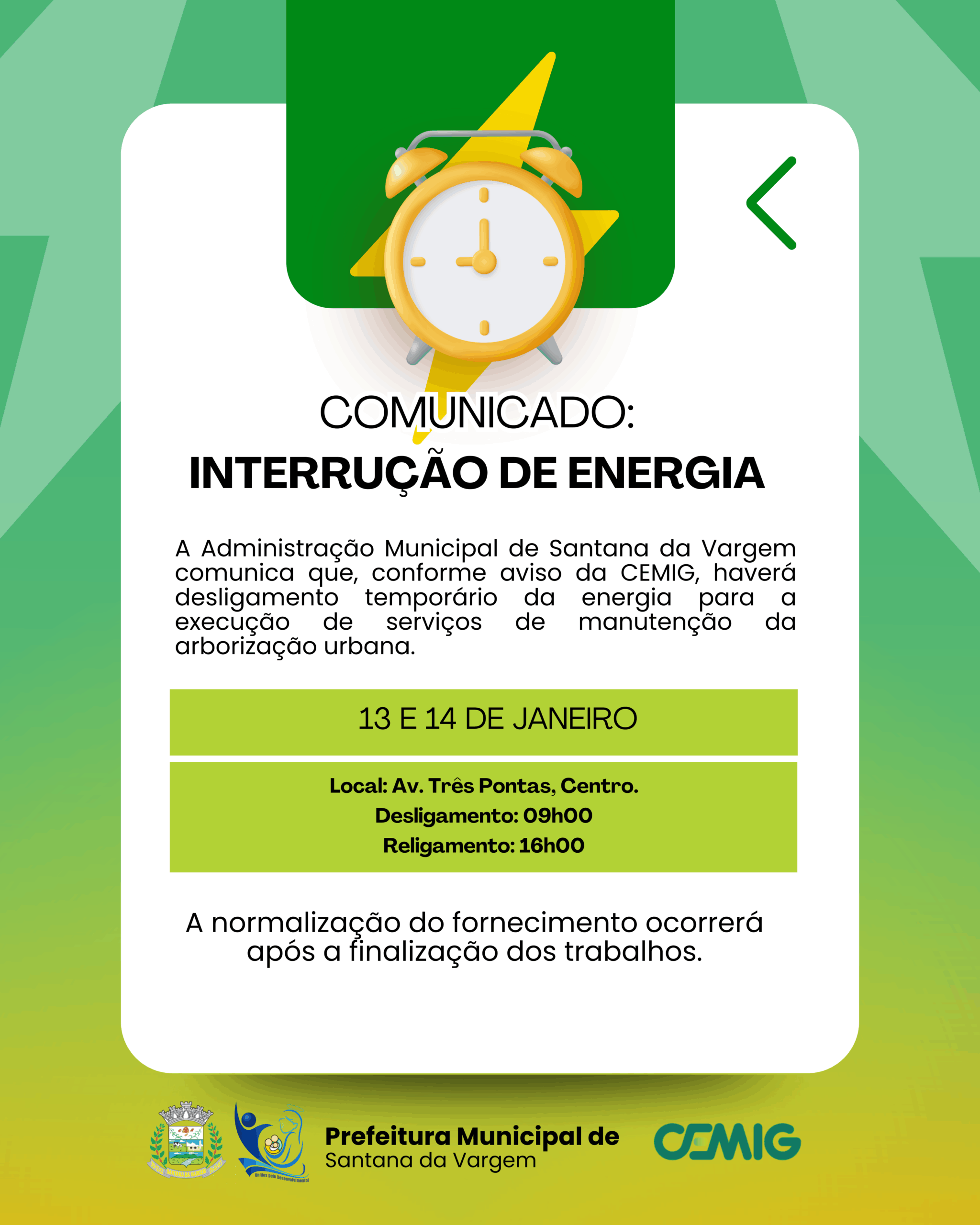 A Administração Municipal de Santana da Vargem comunica que, conforme aviso da CEMIG, haverá desligamento temporário da energia para a execução de serviços de manutenção da arborização urbana. Local: Av. …