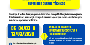 A Secretaria de Educação de Santana da Vargem informa que será realizado o edital do Processo Seletivo Simplificado nº 01/2026 para contratação temporária de Auxiliar de Apoio à Educação Especial. …