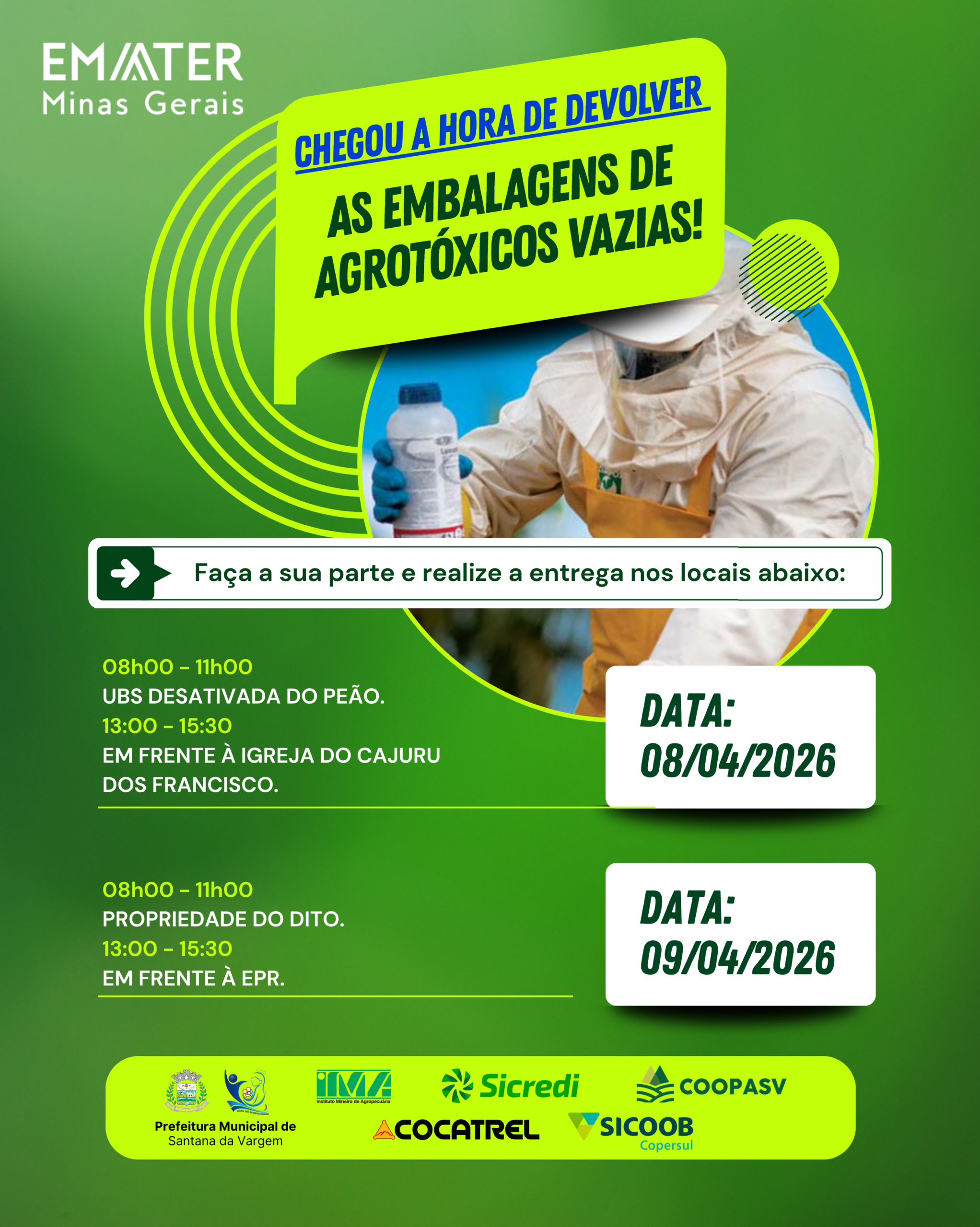 Devolver as embalagens de agrotóxicos é um compromisso com o meio ambiente, com a saúde e com a agricultura responsável. A Administração Pública de Santana da Vargem informa à população …