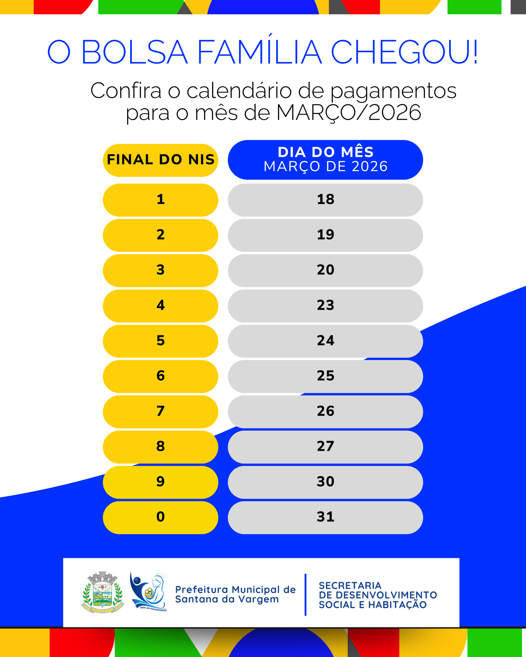 Atenção, pessoal! O pagamento do Bolsa Família de março/2026 começa a cair na conta nesta quarta-feira. Os pagamentos seguem de forma escalonada até o dia 31/03, conforme o final do …