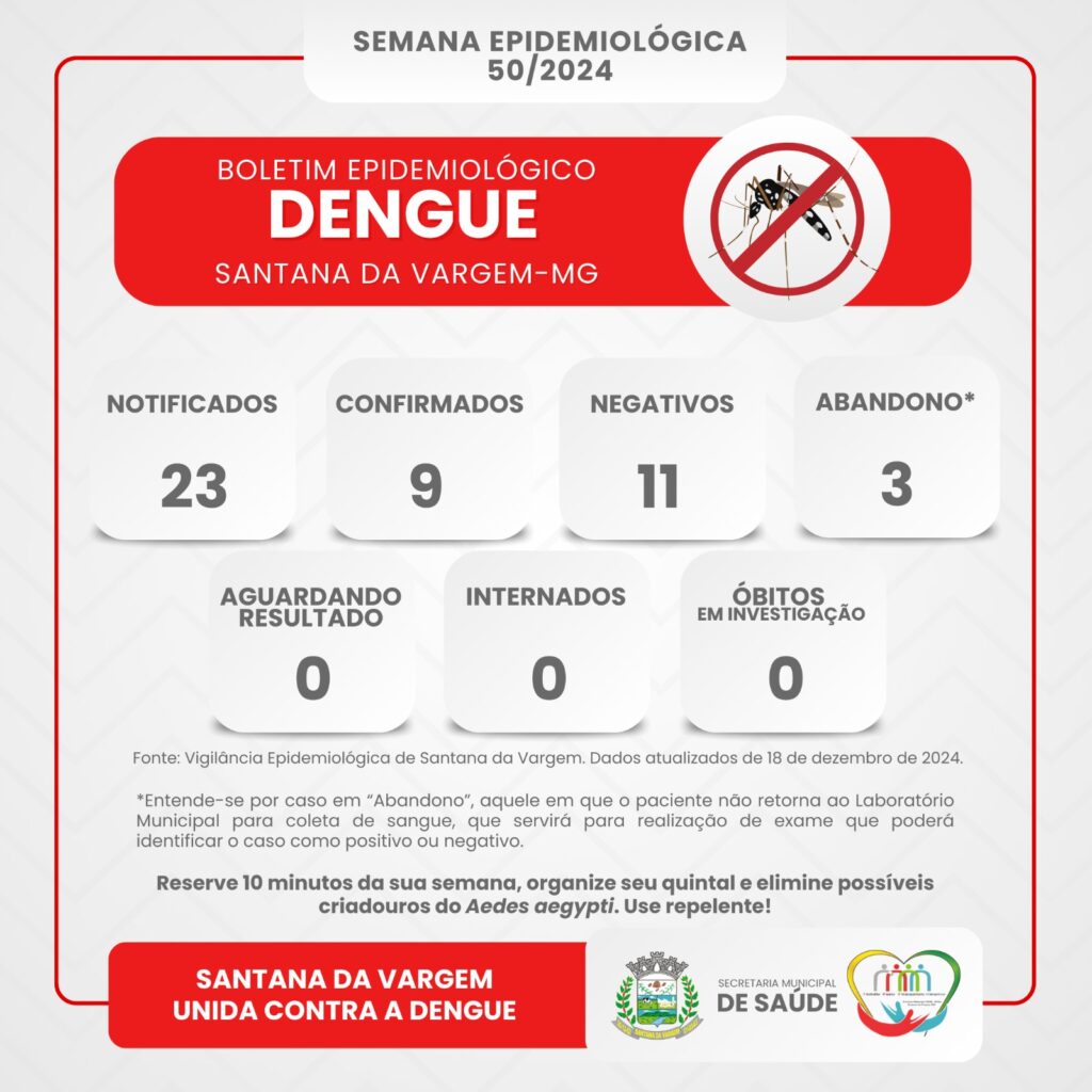 Os dados da Semana Epidemiológica 50 já estão disponíveis para consulta, abrangendo o período de 08 a 14 de dezembro. A divulgação semanal visa garantir maior transparência e organização no monitoramento dos casos no município, em conformidade com o calendário epidemiológico do Sistema de Informação de Agravos de Notificação (Sinan), do Ministério da Saúde.
