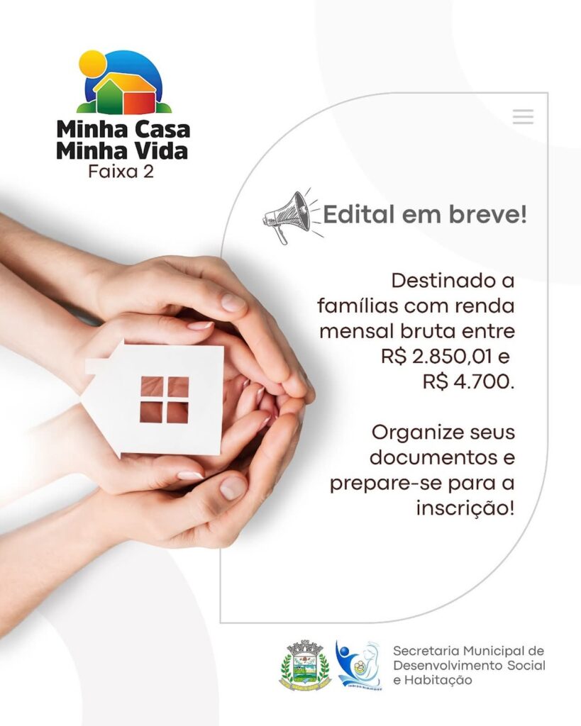 A Administração Municipal de Santana da Vargem, por meio da Secretaria Municipal de Desenvolvimento Social e Habitação (SEMDESH), informa que em breve será lançado o edital de inscrições do Programa Minha Casa, Minha Vida – Faixa 2, destinado a famílias com renda mensal bruta entre R$ 2.850,01 e R$ 4.700.