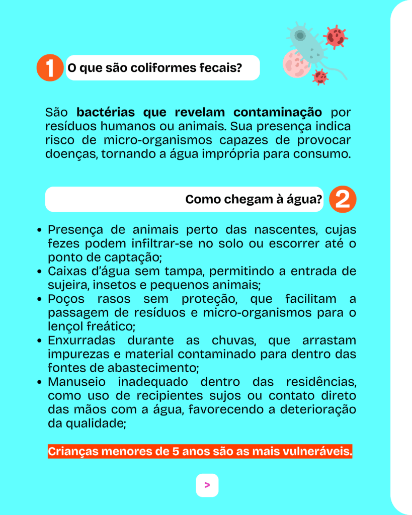 A segurança da água utilizada diariamente é fundamental para a saúde da população. Recentemente, foi identificada contaminação por coliformes fecais em pontos da zona rural, situação que exige atenção e cuidados redobrados.