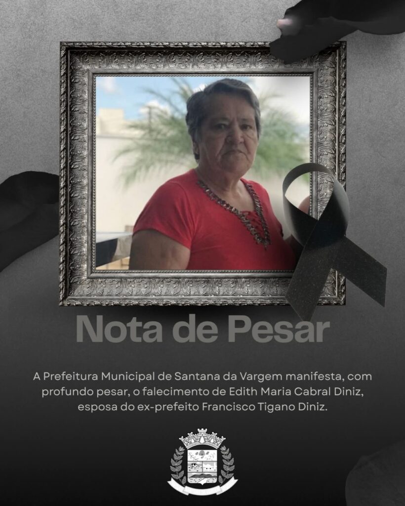 A Prefeitura Municipal de Santana da Vargem manifesta, com profundo pesar, o falecimento de Edith Maria Cabral Diniz, esposa do ex-prefeito Francisco Tigano Diniz.