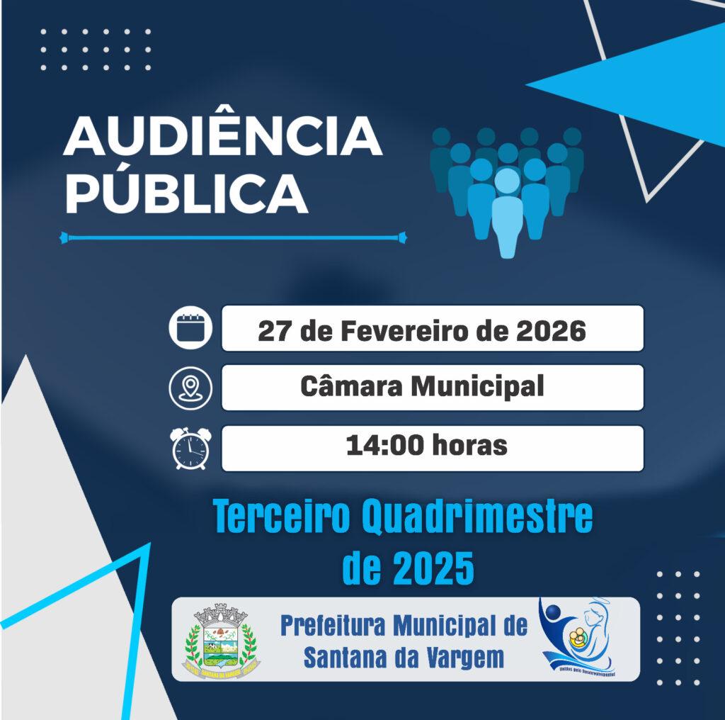 A Administração Pública de Santana da Vargem, por meio da Secretaria de Finanças, convida toda a população para participar da Audiência Pública de Prestação de Contas referente ao Terceiro Quadrimestre de 2025.