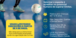Compartilhar: O município de Santana da Vargem, por meio da Secretaria de Cultura, Esporte, Lazer e Turismo, informa a abertura de inscrições para as turmas de futsal destinadas ao público …
