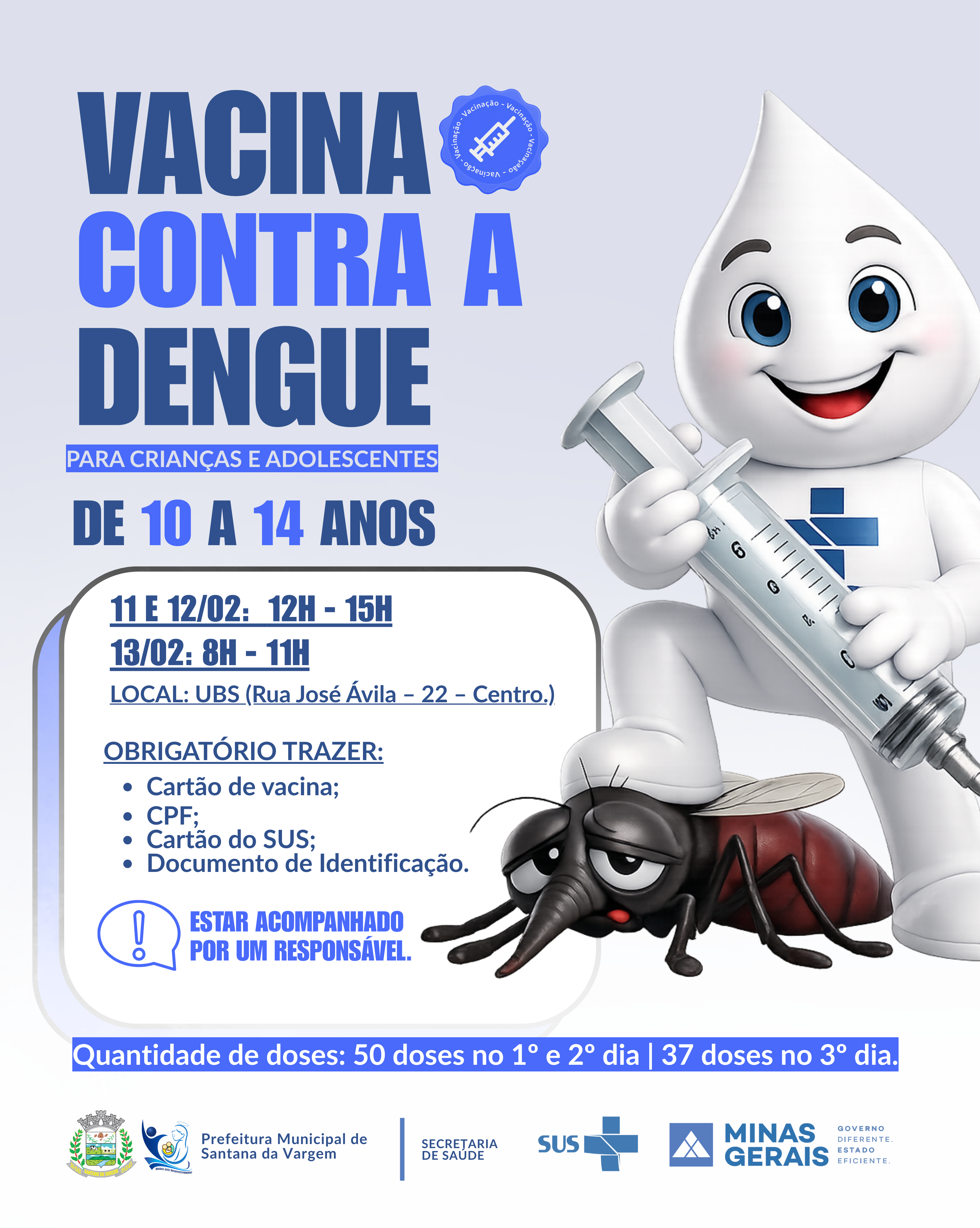 Compartilhar: Santana da Vargem recebeu a primeira remessa com 137 doses da vacina contra a dengue para crianças e adolescentes de 10 a 14 anos. 📅 11 e 12/02: 12h …